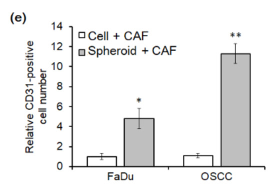 The differential blood vessel formation inside mouse tumors in this study, particularly with the 3D spheroids, can be partly explained with tumor-derived exosomes. Exosomes are an important component of the tumor microenvironment [35]. Recently, exosomes have been reported to play an important role in the crosstalk between CAFs and cancer cells, thereby contributing to carcinogenesis and tumor microenvironment [36]. Yang et al. suggested that specific exosomes released from CAFs can be internalized by cancer cells and contribute to progression and metastasis by transferring various types of substances [36]. Correspondingly, the exosomes released by cancer cells can also promote the transformation of CAFs [36]. Cancer cell-derived exosomes have been shown to play a key role in tumor progression by accelerating angiogenesis [37]. For example, exosomes secreted by tumor cells carry several potent pro-angiogenic factors such as PDGF, VEGF, TGFβ, and bFGF, which mediate angiogenic activities of endothelial cells [38,39]. In addition, it is well known that exosomal miRNAs serve a crucial role in tumor–endothelial crosstalk, thereby regulating angiogenesis and cancer progression. Hsieh et al. demonstrated that HNSCC-derived exosomes enriched in miR-21 promote tumor progression by facilitating angiogenesis and tumor invasiveness [40]. In the present study, exosomes isolated from CM of HNSCC cell spheroid and CAF co-culture caused remarkably higher expression of genes that promote angiogenesis in HSNCC cells than exosomes obtained from CM of FaDu cell and CAF co-culture. Consistent with these results, a recent paper showed that exosomes derived from 3D marrow stem cells had stronger effects on HUVEC cell proliferation, migration, tube formation, and in vivo angiogenesis compared with 2D-derived exosomes [41]. How the cancer cells secret exosomes with differential functions when in the spheroid or dissociated cell state demands further study. Furthermore, the specific substances that promote angiogenesis among exosome components need to be identified.
