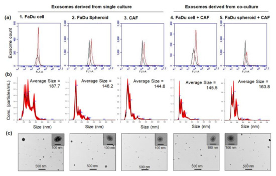 FaDu spheroids or cells were co-cultured with primary CAF2 in DMEM containing 10% FBS and 1% penicillin–streptomycin solution using Transwell (Corning, Tewksbury, MA, USA). The proportion of FaDu cells and CAFs in both 2D and 3D co-culture is 50% and 50%. The sum of the total number of cells in both monoculture and co-culture was 2 × 106. After 24 h, the growth medium was replaced with serum-free DMEM and maintained for 8 h more. The conditioned medium (CM) was collected for exosome isolation. Exosomes were isolated by ultracentrifugation in accordance with the manufacturer’s instructions. Briefly, the CM was centrifuged at 2000× g for 30 min at 4 °C. The supernatant was then transferred to a new tube and combined with Total Exosome Isolation reagent (Invitrogen, Thermo Fisher Scientific, Waltham, MA, USA) and incubated overnight according to the manufacturer’s protocol. The extracellular vesicle was then isolated by centrifugation at 10,000× g at 4 °C for 1 h. The exosome-containing pellets were re-suspended in PBS solution. The yield of the exosome preparation was determined by the Nanoparticle tracking analysis system (Nanosight NS300, Malvern, United Kingdom). CD63 was used as specific exosome markers. To characterize the isolated exosomes, they were bound to the magnetic beads for CD63 capture (CD63 Exo-Flow Capture Kit, EXOFLOW300A-1, System Biosciences, Palo Alto, CA, USA), followed by FACS analysis (Accuri™ C6 Plus Flow Cytometer, Becton Dickinson and Company, Franklin Lakes, NJ, USA). To acquire the TEM image of the exosome, we prepared three grids (200 mesh, 01800-F, Ted Pella Inc., Redding, CA., USA.) coated with Formvar/carbon per sample. Grids were then air-dried and viewed on a Bio transmission electron microscope (Hitachi TEM HT7700, Tokyo, Japan).