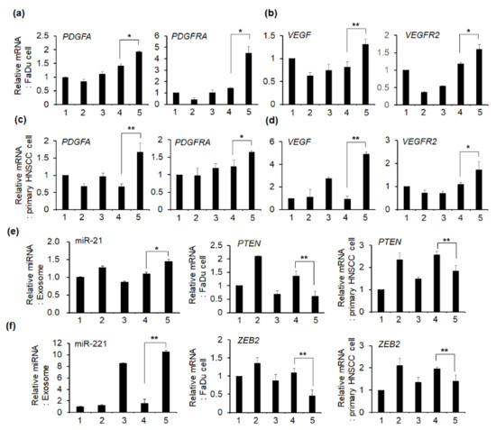 Effect of tumor-derived exosomes on the mRNA expression (fold change) of angiogenesis-related genes in HNSCC cells. (a–d) After treating each exosome isolated from CMs (1–5) with the same concentration for 48 h, FaDu and primary HNSCC cell mRNA was extracted and qPCR analysis was performed. (e,f) After extracting miRNA from exosomes isolated from CMs, miR-21 and miR-221 expression levels were analyzed using TaqMan MicroRNA Assay Kit. mRNA expression of PTEN and ZEB2, direct target genes of miR-21 and miR-221, respectively, was compared in HNSCC cells treated with exosomes for 48 h. PCR analysis was performed two times in triplicate; representative data are shown. The fold change of each mRNA with the mean ± standard deviation is presented (* p < 0.05, ** p < 0.01). The number of CM from which the exosomes are isolated is as follows: 1, FaDu cell; 2, FaDu spheroid; 3, CAF; 4, FaDu cell + CAF; 5, FaDu spheroid + CAF.