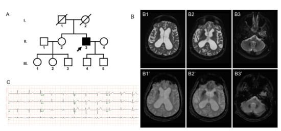 Clinical features of the patient with the KCND3 c.1256G>A (p.R419H) variant. (A) Pedigree of the patient characterized in current study. In this pedigree, the heterozygous KCND3 variant was detected in the male individual II.3, who is now 70 years old. The patient’s father (I.1) passed away in his seventies due to heart failure, and his mother (I.2) in her eighties due to chronic obstructive pulmonary disease. He has a sister (II.2) who is five years older than him. His two sons (III.4 and III.5) are now in their thirties. Arrow denotes the index case who harbors the KCND3 c.1256G>A (p.R419H) variant. Filled symbol represents symptomatic member. Open symbols indicate unaffected individuals. Circles stand for females. Squares correspond to males. Diagonal lines refer to the deceased. (B) Neuroimages of the patient. The axial T2-weighted (B1–B3) and the corresponding gradient-echo sequence (B1′–B3′) images demonstrate hypointensity in bilateral caudate nuclei (B1,B1′) and lentiform nuclei (B2,B2′) of the basal ganglia, as well as in bilateral dentate nuclei of the cerebellum (B3,B3′). (C) Standard 12-lead ECG indicates normal sinus rhythm.
