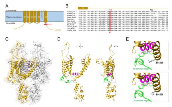 Protein structure modeling of human KV4.3 WT and the p.R419H variant. (A) Schematic representation of the membrane topology of a single KV4.3 subunit, highlighting the cytoplasmic localization of the residue p.R419 in the proximal carboxyl-terminal region close to the S6 transmembrane segment. (B) Amino acid sequence alignment of human KV4.3 with various KV4-related proteins from multiple animal species. The highly conserved p.R419 residue is decorated in red and marked with an asterisk. (C–E) Homology model of KV4.3 was based on the crystal structure of the voltage-dependent K+ channel KV1.2 (PBD ID: 3LUT) and generated using UCSF Chimera interfaced with Modeller. (C) Tetrameric structure of the KV4.3 channel. One KV4.3 monomer is displayed as ribbon in gold, with the other subunits in gray. The shadow refers to the surface representation of the homology model. Purple spheres denote K+ passing through the pore region. (D) (Left panel) The single KV4.3 subunit in gold in (C) is shown here. (Right panel) The same KV4.3 subunit is viewed with 90-degree rotation clockwise. The red asterisk highlights the location of the residue p.R419. The S4-S5 linker is shown as magenta helix, and a portion of the amino (N)-terminal region is colored in green. The area enclosed by dotted lines in the right panel is enlarged for inspection in (E). (E) Comparison of the side-chain structure of the p.R419 WT and the p.H419 variant with respect to the local microenvironment.