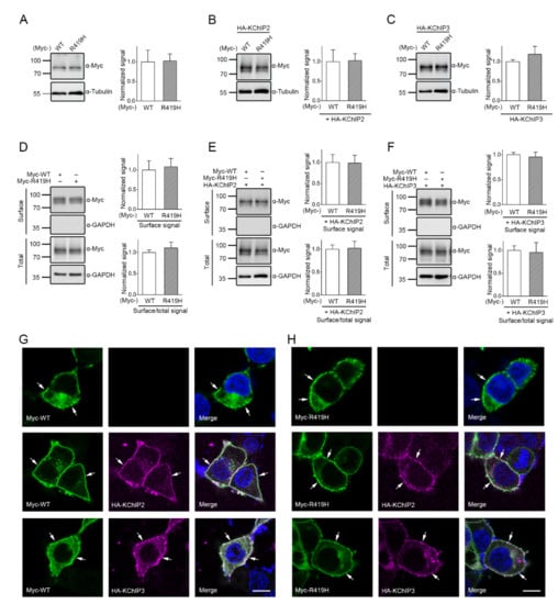 Biochemical and immunofluorescence characterizations of human KV4.3 WT and the p.R419H variant. Myc-KV4.3 subunits were expressed in HEK293T cells in the absence or presence of auxiliary HA-KChIP2 and -KChIP3 subunits. (A–C) (Left panels) Representative immunoblots. Proteins were detected with anti-Myc (α-Myc) and anti-tubulin (α-Tubulin) antibodies. Molecular weight markers (in kDa) are labeled to the left. (Right panels) Quantitative analyses indicating comparable protein level of the WT and the p.R419H KV4.3. Total KV4.3 protein density was standardized with cognate tubulin level, followed by normalization with respect to the WT (n = 4–6). (D–F) Surface biotinylation analyses for Myc-KV4.3 subunits in the absence (D) or presence of auxiliary HA-KChIP2 (E) and -KChIP3 (F) subunits. Representative immunoblots and quantitative analyses for the surface signals are shown at the left and right panels, respectively (n = 4). The surface/total ratio corresponds to membrane trafficking efficiency. (G,H) Representative immunofluorescence images demonstrating similar subcellular localization pattern of KV4.3 WT and p.R419H (green) in the absence (top panels) or presence of KChIP2 (middle panels) and KChIP3 (bottom panels) (magenta). Cell nuclei were counterstained with DAPI (blue). Arrows denote membrane localization. Merged images are shown in the right panels. Scale bar: 10 μm.