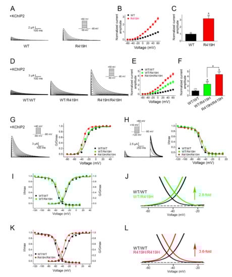 2.4. Dominant Gain-of-Function Effect of the p.R419H Variant on KV4.3 Channel Function