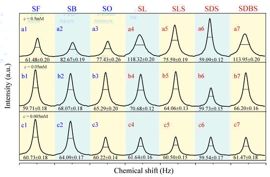 The half-peak width of the 17O NMR line is used as an index to measure the average relative size of the cluster of liquid water, as shown in Figure 1. The wider the spectral line, the bigger the water cluster, and vice versa []. Upon comparing the half-peak width values of these functional molecules to that of pure water (73.98 Hz), we found that the average size of water clusters is smaller in the SDS–water and SF–water system at the series of concentrations (All the abbreviations of functional molecules are defined and listed in Table 1). From 0.5 mM to 0.005 mM, the decreasing ratio of the half-peak width in the SF–water system reaches 16.9–19.3%, and that in the SDS–water system reaches 19.3–20.1%. When the concentration is 0.005 mM, the decreasing of the half-peak width in all the functional molecules reaches the range of 16.9–19.5%. Compared with a previous report [], the functional molecules in our study can reduce the size of water clusters to a large extent, and the effective concentration of the molecules is 1–2 orders of magnitude lower.