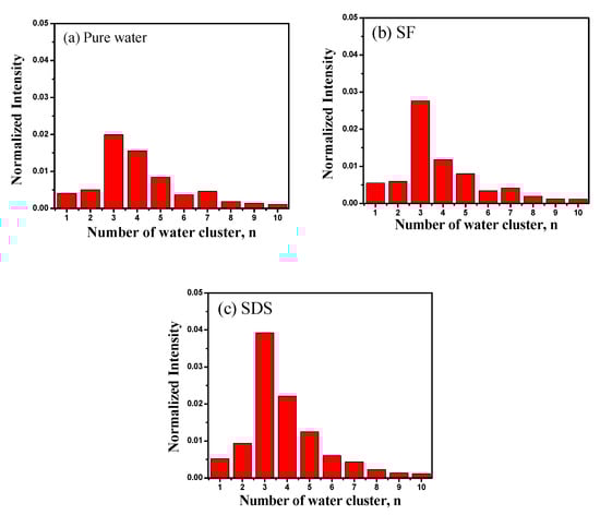 SF–water and SDS–water systems at 0.05 mM were selected and tested through in situ liquid SIMS measurements, in which the distribution of water clusters can be determined with direct molecular evidence. H(H2O)n with n = 2–4 are considered to be the main SWC types for the liquid water, in which H(H2O)3+ is the most dominant one [,]. It is notable that the percentage of the normalized signal intensity of SWCs (n < 5) to the detected water cluster ions (n = 1–4) in SF–water and SDS–water systems is 71.9% and 73.4%, respectively, which is higher than 67.8% in the pure water system (Figure 2). The presence of SF and SDS makes the amount of SWCs increase, indicating that these two functional molecules can destroy big water clusters and facilitate the formation of SWCs, supporting the conclusion from the 17O NMR results that they can turn big water clusters into small and uniform water clusters. By contrast, halide anions were introduced to pure water, but the total content of SWCs was not significantly increased in comparison with that of pure water [].