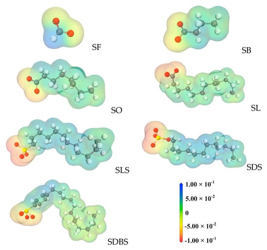 HLB values of the functional molecules evaluated by the method of molecular structure [] are shown in Table S1, indicating that a bigger HLB value represents stronger hydrophilicity. Among the functional molecules, the sequence of hydrophilicity is SDS > SF > SB > SO > SL > SLS > SDBS. ESP results are shown in Figure 3, where darker color red represents more electrons gathering. Except for the SF molecule, the other functional molecules all have relatively separated positive and negative ESPs due to the long distance between anionic and cationic groups, leading to the electrostatic interaction []. Comparing the four functional molecules with the same hydrophobic chain length but different anion head groups, the decreasing order of negative ESP is SDS > SLS > SDB S > SL. The presence of oxygen atoms in the molecular structure is the main prerequisite for negative ESP and, consequently, the sequence of the ESP is determined by the number of oxygen atoms in the head groups. It agrees with the results from NMR experiments that more SWCs can be formed under the regulation of functional molecules with stronger negative ESP. Accordingly, SDS molecules, owning the strongest negative ESP and the strongest hydrophilicity, facilitate the formation of the small water clusters.