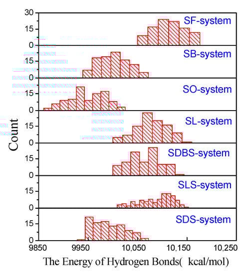 The histograms of energy of the hydrogen bond after adding functional molecules (the y-axis represents the number of times the hydrogen bond energy occurs in the simulation process).
