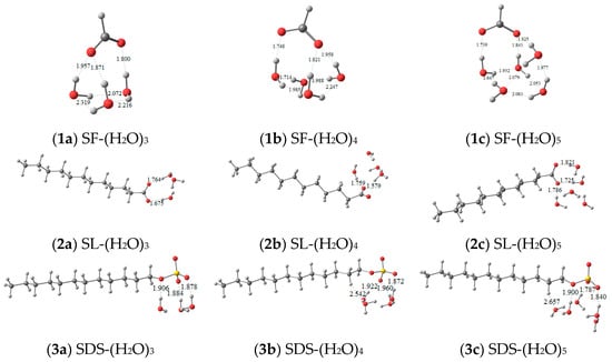 Optimized geometries of (H2O)n=3–5 with SF (1a–c), SL (2a–c), and SDS (3a–c).
