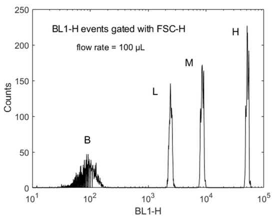 The Attune NxT flow cytometer (ThermoFisher Scientific, Waltham, MA, USA) was used to analyze a sample containing four latex bead populations, each with progressively larger loading of dye molecules. The beads were obtained as a special order from Thermo Fisher Scientific. The bead diameter was 5.2 µm. The fcs files were read using the fca_readfcs program [21] and analyzed using MATLAB (Natick, MA, USA). The horizontal axis, called BL1-H, shows the height of the fluorescence photon pulse detected by the BL1-H channel when a bead passes the 488 nm blue laser beam. The vertical axis shows the number of times a particular signal was observed during the FC analysis of the bead sample. The histogram was created by first using MATLAB function histocounts to get the edges of 512 bins of log-scaled BL1-H data, and then using the function histogram to bin the data using linear values of the edges. In practice, about 10,000 beads were included in the analysis.