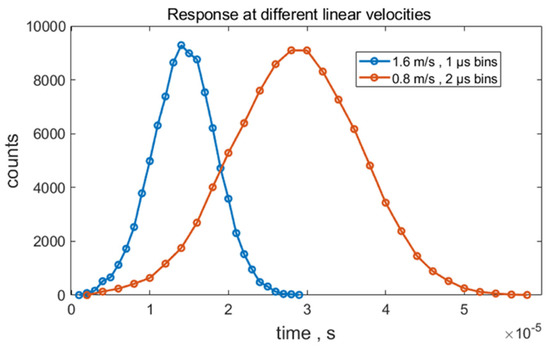 Model calculation of the time sequence of outputs from the analog-to-digital converter for a single transit of a bead through the laser beam. The pulse height is about 9100 digital units and represents one event on the histogram in Figure 1. The blue and orange dots are for beads with different linear velocities. The model automatically adjusts the time bin width to give the same pulse height at different linear flow velocities.