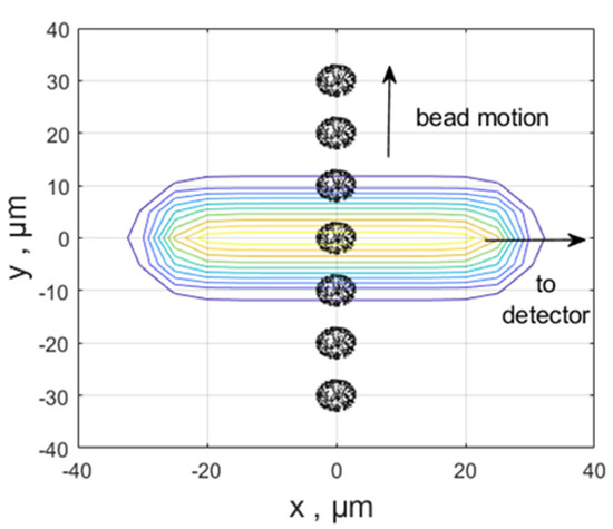 The light energy absorbed by the entire bead is the sum of light energy absorbed by the individual labels bound to the bead. The dots on the colored spheres in Figure 3 represent labels on the surface or inside the bead. Figure 3 shows seven consecutive positions of a bead traversing the laser beam. The dots are the result of the stochastic labeling model (assuming a random distribution throughout the bead volume). Each dot has a specific x-, y-, z-coordinate. The laser beam travels along the z-direction (out of the figure). The laser beam has a flat-top shape with intensity variation in the x–y plane and is polarized in the y-direction (Appendix A). The detector axis coincides with the x-axis. The cell travels in the y-direction, and, as it traverses the laser beam, the labels are illuminated. The illumination is calculated by simply evaluating the laser beam intensity at the location of each label. The optical absorption rate (absrate) for the entire bead was calculated following Equation (1).