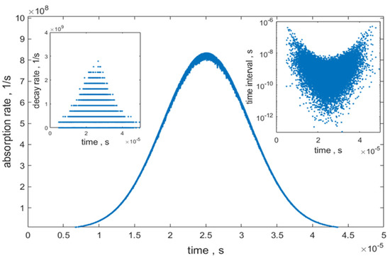 Results of calculated absorption and decay rates during the bead transit The absorption rates are displayed by the central trace while the decay rates are shown in the left inset. The decay rates are staggered due to different occupation numbers of excited states during the bead transit time of the laser beam. The time is started when the center of the bead is at −30 µm in Figure 3 and ends when the bead reaches +30 µm. The inset on the right shows the distribution of time intervals between any two sequential absorption/decay events.