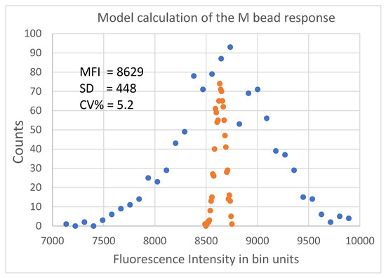 The blue circles in Figure 5 are a model representation of the measured MFI peak, M, shown in Figure 1. The model calculates the response of one bead population at a time, and the histogram in Figure 5 uses linear bin space. The histogram in Figure 1 was formed using the log of the pulse heights given in the fcs file, and 512 histogram bins were distributed uniformly in log space. The differences in histogram properties were considered when comparing the measured average height obtained from the fcs file and the model calculation.