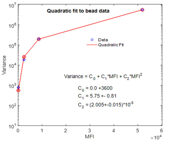 The blue circles show the measured values of the variance plotted against the corresponding values of MFI. The orange dots show the variance and MFI obtained from the model. In most cases, the orange circles overlay the blue circles. The red trace is the fit to a quadratic polynomial with the fitted function shown in the inset. The plot was made using data in Table 4.
