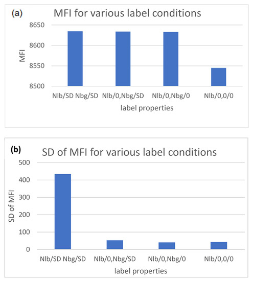The stochastic model was used to calculate the MFI and the SD for various label conditions. The results are shown in Figure 7 for bead M, where each bar in Figure 7a gives the MFI for 128 independent calculations for the same label condition, as indicated at the bottom of the bar. For example, the first bar gives the result of 128 calculations for the case where Nlb = 364, SD = 19, and Nbg = 4, SD = 2. The second and third bars correspond to calculations with some of the SD values set to zero. The last bar gives the result for the case where Nlb = 364 while Nbg and all the SD values are set to zero. The first bar represents the realistic case where all label values fluctuate, and the last bar represents the ideal case where all label numbers are constant and only detection statistics contribute to the SD of MFI, resulting in CV% = 0.45. Adding fluctuation to Nbg increases the resulting CV% of MFI to 0.57. The results shown in Figure 7b suggest that, while Nbg has a measurable effect on MFI, its contribution to CV% is minimal. The dominant contributions to measured values of both MFI and SD come from the label number and its fluctuation. This observation suggests that the measured values of MFI and SD, shown in Table 2, can be converted to values associated with the number of labels on the beads by using procedure to subtract the contribution of background from the measured values of MFI and SD. The proposed procedure is discussed below.