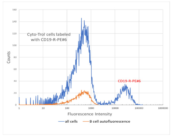 The PBMC samples (Cyto-Trol, from Beckman Coulter Life Sciences, Indianapolis, IN, USA; Vericell, from BioLegend, San Diego, CA, USA)) were resuspended according to the prescribed protocol of the manufacturer and were labeled with a CD19-R-PE dye. The antibody to CD19 binds to the CD19 surface antigen, which is expressed mainly by B cells. The samples of PBMC were analyzed on a Attune NxT flow cytometer. The flow cytometer was run with the simplest possible configuration, including forward scattering channels (FSC-A, FSC-H), side scattering channels (SSC-A, SSC-H), and a fluorescence channel (R-PE-H) for detecting the R-PE fluorescence emission. Compensation correction was disabled.