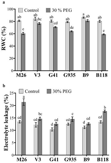 Physiological changes in six apple rootstocks in response to osmotic stress. Relative water content (RWC) (a) and electrolyte leakage (EL) (b) in six apple rootstocks (M26, V3, G41, G935, B9 and B118) were assessed three days after treatment with 30% PEG. Means from all treatments were compared with each other using Tukey’s test. Vertical bars represent the mean ± SEM of three biological replicates (three plants each). Bars with no common letters are significantly different (p < 0.05).