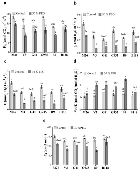 Changes in photosynthesis-related parameters in six apple rootstocks under osmotic stress conditions. Photosynthesis rate (PN) (a), stomatal conductance (gs) (b), transpiration rate (E) (c), WUE (PN/E) (d) and intercellular CO2 concentration (Ci) (e) observed in control and osmotic-stressed apple rootstocks (M26, V3, G41, G935, B9 and B118) three days after treatment with 30% PEG Means from all the treatments were compared with each other using Tukey’s test. Vertical bars represent the mean ± SEM of three biological replicates (three plants each). Bars with no common letters are significantly different (p < 0.05).