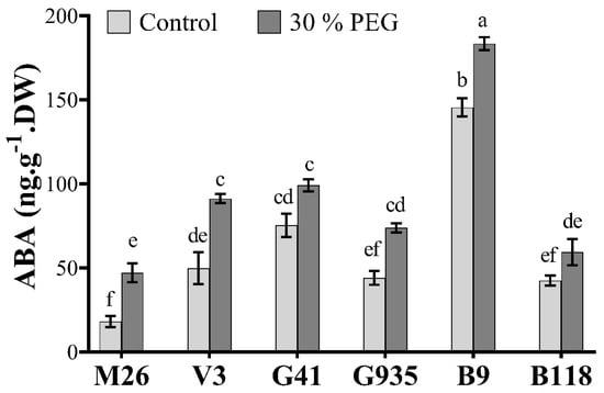 The PEG-induced osmotic stress increased ABA levels in all tested rootstocks with a significant increase in M26, V3, G935 and B9 by 61.5%, 45%, 40% and 20.6%, respectively (Figure 3). The concentration of ABA differed among the rootstocks under control and osmotic stress conditions, although it was not always statistically significant. In general, B9 had the highest ABA content under both control and stress conditions. In contrast, M26 had the lowest ABA level under control and stress conditions. Besides, V3, G41, G935 and B9 showed significantly higher ABA levels than M26 under osmotic stress