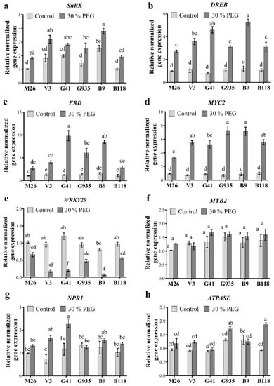 Expression profiles of eight ORGs (a–h) in six apple rootstocks (M26, V3, G41, G935, B9 and B118) exposed to 30% PEG treatment for 3 days. Genes differentially expressed in plants under stress conditions were normalized with MdEF1A. Means from all the treatments were compared with each other using Tukey’s test. Vertical bars represent the mean ± SEM of three biological replicates (three plants each). Bars with no common letters are significantly different (p < 0.05).