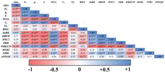 Correlation matrix to investigate the dependence between ABA concentration, physiological parameters (PN, gs, E, WUE, Ci, EL and RWC) and transcript levels of ORGs (SnRK, DREB, MYC2, ERD, WRKY29, MYB2, NPR1 and ATPASE) in all apple rootstocks after treatment with 30% PEG. The blue color indicates a positive correlation and the red color indicates a negative correlation. Asterisk(s) indicate(s) significant differences at * p < 0.05, ** p < 0.01 according to Pearson correlation test.
