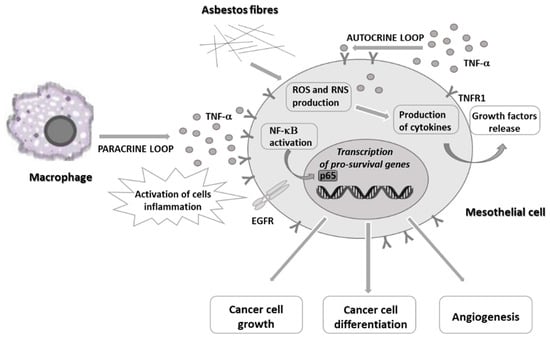 The prolonged inhalation of asbestos fibers leads to chronic inflammation within the pleura and, as a consequence, facilitates carcinogenic processes. Asbestos fibers mechanically damage the integrity of mesothelial tissue, leading to a local inflammatory response with observed overproduction of free radicals (reactive oxygen species, ROS, and reactive nitrogen species, RNS) and pro-inflammatory cytokines [,]. At the beginning of the inflammatory process, the tumor necrosis factor-alpha (TNF-α) and its downstream nuclear factor kappa B (NF-κB) signaling pathway play a critical role. Upon mechanistic injury, mesothelial cells secrete high-mobility group bax 1 protein (HMGBP1), which stimulates macrophages recruitment in the surrounding space of the damaged mesothelial cells and releases excessive amounts of TNF-α mediator []. TNF-α acts directly with its receptor TNF-R1 expressed on the surface of human mesothelial (HM) cells []. In turn, this interaction stimulates HM cells into further autocrine release of TNF-α, which finally activates and accelerates NF-κB downstream signaling, mainly pro-survival gene transcription by the p65 subunit of NF-κB, skipping an apoptosis process of the injured cells []. Consequently, HM cells intensively divide rather than dying, causing mistakes in the uncontrolled division that accumulates DNA synthesis, leading to malignant mesothelial cell transformation (Figure 1).