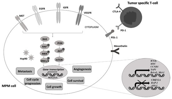 Several alterations in genes and molecular pathways related to mesothelial cell proliferation, susceptibility to apoptosis, and angiogenic processes are observed under MPM carcinogenesis []. The most frequent in MPM pathogenesis are genetic mutations in tumor suppressor genes (including neurofibromin 2 (NF2, merlin), cyclin-dependent kinase inhibitor 2A (CDKN2A), which shares a locus for both p16/INK4 and p14/ARF, and BRCA-associated protein-1 (BAP-1). The observed genetic alternations in these genes play a significant role in MPM development due to their direct involvement in controlling cell shape, adhesion, and cell growth []. Some additional alternations involve Wnt/β-catenin signaling pathways, as well as epigenetic silencing of metabolic pathway-related genes, including arginine succinate synthase (ASS1) []. High expression of angiogenic growth factors (e.g., vascular endothelial growth factor, VEGF) as well as their surface receptors (e.g., VEGFR, EGFR (epidermal growth factor receptor) or MET (hepatocyte growth factor receptor) and other glycoproteins (mesothelin) is a predominant determinant of intracellular signaling pathways in carcinogenic MPM cells []. These molecular factors and their downstream molecular pathways are currently intensively investigated and comprise the first line of interest in targeted MPM treatment strategy (Figure 2). However, until now, no significant effects have been observed in the case of anti-angiogenic drugs (in either VEGF/VEGFR or PDGF/PDGFR (platelet-derived growth factor/PDGF receptor targets)) or pro-apoptotic therapies including histones deacetylases inhibitors (HDAC) and PI3K/AKT/mTOR pathway (phosphatidylinositol-3-kinase and alpha serine/threonine-protein kinase) [,]. Both targeted therapies, including anti-mesothelin, anti-MET, and anti-Hsp90 (Heat shock protein-90) antibodies, and immunotherapies with predominant immune checkpoint inhibitors (anti-CTLA-4, anti-PD-1, and anti-PD-L1) are still under clinical trials due to lack of direct recommendations of such treatment to MPM patients.