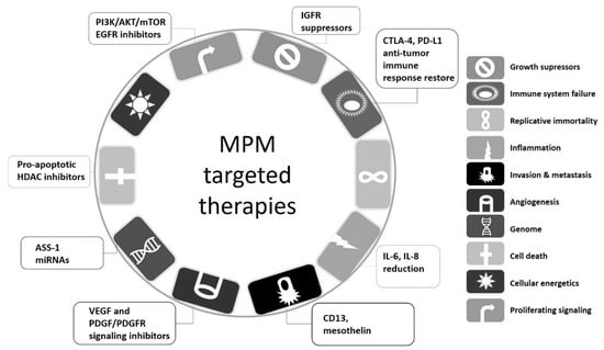 In summary, currently, there are several widespread targets in studies of mechanism and MPM therapy, as collected in Figure 3. They focus on inflammation reduction (IL-6 and IL-8), immune system failure (by blocking CTLA-4 and PD-1 receptors on unresponsive T-cells), invasion and metastasis (by anti-mesothelin as well as anti-CD13 expressed on tumor endothelium), but also angiogenesis (via an anti-VEGF approach) as well as direct cell death (by HDAC inhibitors, which induce tumor-cell-selective expression of pro-apoptotic genes). The miRNAs [] and ASS-1 remain obvious targets for genomic alterations, whereas changes in cellular energetics, oxidative stress, or processes of replicative immortality still remain new and are not well-investigated and incorporated into the trials. Therefore, further in-depth research on possible targets is still ongoing, in both in vitro and in vivo models.