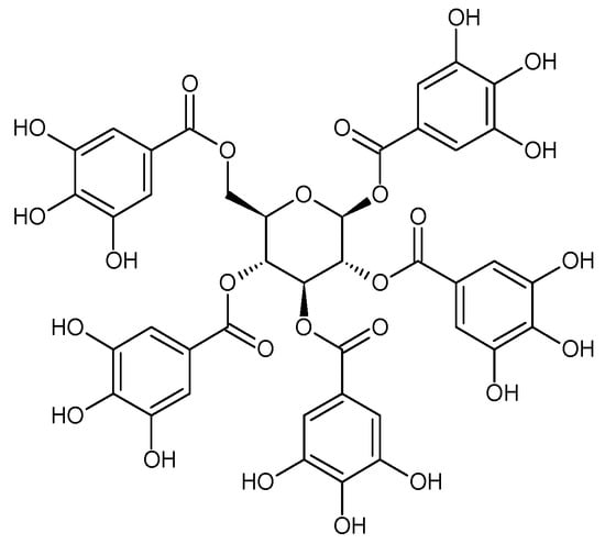 In the light of the revealed significant antioxidant activity and protective role in the whole human body of polyphenols and other natural compounds, phytochemicals are increasingly considered dietary supplements in anticancer therapy []. Recent studies demonstrated that polyphenol-rich plant extracts abolish common side effects, such as cardiotoxicity and nephrotoxicity, associated with standard chemotherapy in tumor-bearing patients []. For instance, Zhang et al. summarized in detail the beneficial results of penta-O-galloyl-β-D-glucose (PGG), a gallotannin that is a penta-gallic acids ester of glucose (Figure 4), not only in diabetes treatment but particularly in anticancer therapies including prostate, lung, and breast cancers. PGG can reveal antitumor potential through several mechanisms, including anti-angiogenic and metastatic properties (through the VEGF inhibition and direct diminishing the activity of matrix metalloproteinase-9, MMP-9), antiproliferative actions (through S-phase perturbation and immediate G0/G1 growth phase arrest), and the anti-inflammatory and antioxidant role in normal, healthy cells (by scavenging reactive oxygen species (ROS) in a dose-dependent manner) []. It seems that several key carcinogenic molecular players are targets for not only PGG antitumor activity but also other phenolic derivatives. These include nuclear factor-kappaB (NF-κB) and tumor suppressor genes (P53 and retinoblastoma, Rb) [].