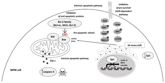 On the other hand, the synergistic activity of resveratrol and cisplatin led to increased ROS production and induced apoptosis through promoted mitochondria oxidative damage events []. The most significant role in oncogenesis is transcription factor Specificity Protein 1 (Sp1). That protein is abundantly expressed in different tumor cells and controls the transcription of oncogenes and tumor suppressors and genes involved in cancer proliferation, differentiation, apoptosis, genetic material damage responses, and so on []. Thus, this particular signaling factor seems to be a promising target for anticancer management. Lee KA et al. demonstrated that resveratrol induced growth arrest of MSTO-H211 cells at the Sub-G1 phase in vitro study and directly suppressed Sp1 protein level and expression of Sp1 regulatory genes cyclin D1, p21, p27, surviving, and myeloid cell leukemia (Mcl-1) []. Concomitantly, Lee YJ et al. confirmed that resveratrol combined with clofarabine reduced the nuclear accumulation of Sp1 and decreased the levels of p-Akt, Sp1, c-Met, cyclin D1, and p21 in MSTO-H211 cells upon the synergistic antiproliferative []. Finally, resveratrol alone reduced MSTO-H211 tumor growth in a BALB/c athymic (nu+/nu+) mice animal model via the inhibition of Sp1 expression. The authors observed a decreased tumor volume and activation of pro-apoptotic signals transduction []. The Mcl-1 protein seems to be a direct downstream target, responsible for the observed effect of treatment of malignant mesothelioma cells with resveratrol and clofarabine, locking the apoptotic pathway. The downregulation of Mcl-1 protein after administrating the resveratrol and clofarabine formulation restored the growth-inhibitory effect and induced the caspase-3 activation pathway [].
