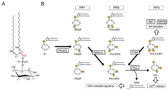 The pathology of schizophrenia involves changes in the brain, and total lipids make up half of the brains dry weight. Moreover, approximately 60% of total lipids are phospholipids [,,], which are amphipathic molecules that form a lipid bilayer and are the main component of biological membranes. Phospholipids are classified into glycerophospholipids and sphingophospholipids based on their backbone. Among the glycerophospholipids, some are abundant in the cell membrane, such as phosphatidylcholine, phosphatidylethanolamine, phosphatidylserine, and phosphatidylinositol (PI) [,] (Figure 1A). Phosphoinositides (PIs), a collective term for PI and its phosphorylated derivatives, are involved in intracellular signal transduction as substrates for second messenger production (Figure 1A,B). Additionally, they localize target proteins to biological membranes by binding to their specific binding motifs. Structurally, fatty acid residues are bound to the C1 and C2 positions of the glycerol backbone of PI, and inositol, which can be phosphorylated at positions 3, 4, and 5 to produce PIs, is bound via the phosphate at the C3 position. More than 240 PIs have been identified in vivo as more than 30 combinations of fatty acid residues and eight phosphorylation states are possible [,].