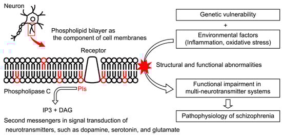 Phospholipids play a crucial role in the structure and function of the brain []. They are degraded by several classes of phospholipases and act as second messengers in signaling pathways in neural and glial cells []. Therefore, adequate phospholipid production is essential for normal brain function, and alterations may be associated with the pathophysiology of schizophrenia [] (Figure 2). Studies have focused on the relationship between schizophrenia and lipids since the 1970s, when researchers suggested that the prostaglandins synthesized from phospholipids are associated with schizophrenia [,]. Multiple studies have shown decreased levels of polyunsaturated fatty acids in the cell membrane of red blood cells from patients with schizophrenia, and this discovery has been confirmed by meta-analyses [,]. However, because a Cochrane review [] indicated that the clinical effects of polyunsaturated fatty acid administration for schizophrenia have been inconsistent among studies, it was suggested that alterations in fatty acid levels are not the main contributor to the pathophysiology of schizophrenia. Instead, to elucidate the cause of schizophrenia, researchers need to focus on phospholipids, which are the main source of lipid signaling-associated fatty acids in the brain tissue [].
