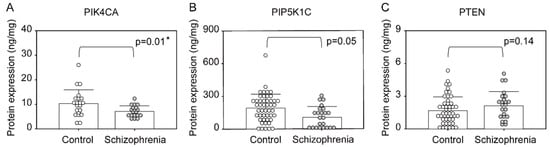Expression levels of phosphoinositide signaling-associated proteins in the prefrontal cortex of patients with schizophrenia and controls. (A): PIK4CA, (B): PIP5K1C, (C): PTEN. Means ± SD are shown as bars and whiskers. * p < 0.05.