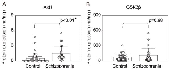 Expression levels of proteins downstream of phosphoinositide signaling pathway in the prefrontal cortex of patients with schizophrenia and controls. (A): Akt1, (B): GSK3β. Means ± SD are shown as bars and whiskers. * p < 0.05.