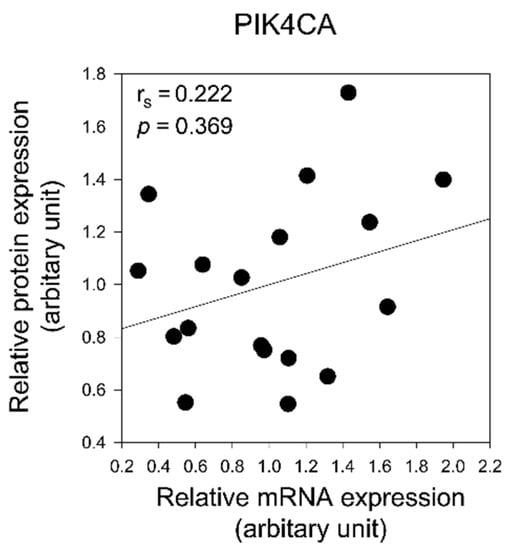 To confirm whether the expression levels of PIK4CA and Akt1 proteins are regulated by mRNA expression levels, we analyzed the correlation between mRNA and protein expression of PIK4CA and Akt1. There was no significant correlation between mRNA and protein expression for either PIK4CA or Akt1 (Figure 5 and Figure 6).