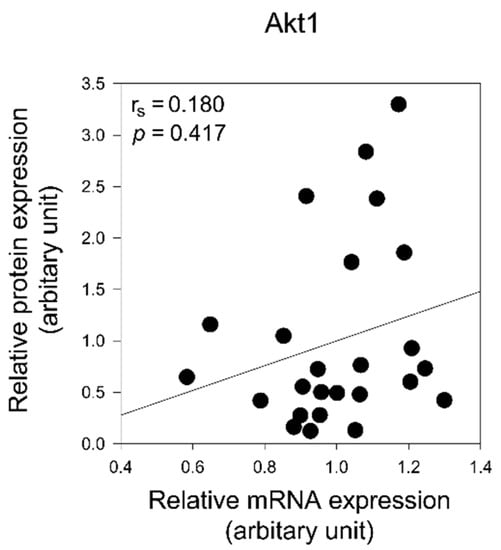 Correlation analysis of mRNA and protein expression of Akt1 in the prefrontal cortex of patients with schizophrenia. Spearman’s correlation coefficient (rs) and p value are indicated. The lines indicate the correlation trend.