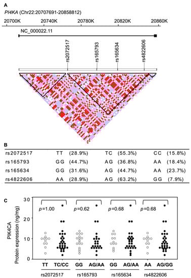 (A). Linkage disequilibrium map of PI4KA locus, the gene encoding PIK4CA protein showing the four SNPs (rs165634, rs165793, rs2072517, and rs4822606) analyzed in this study. For linkage disequilibrium analysis, we used the Japanese healthy controls in the database of the 1000 Genomes Project. Haploblocks were drawn using Haploview v.4.2 software with standard color scheme. (B). The allele frequencies of each SNPs of PI4KA. (C). The effect of SNPs variants of PI4KA on the protein expression of PIK4CA. The expression levels of proteins were compared between groups using the Mann–Whitney U-test.