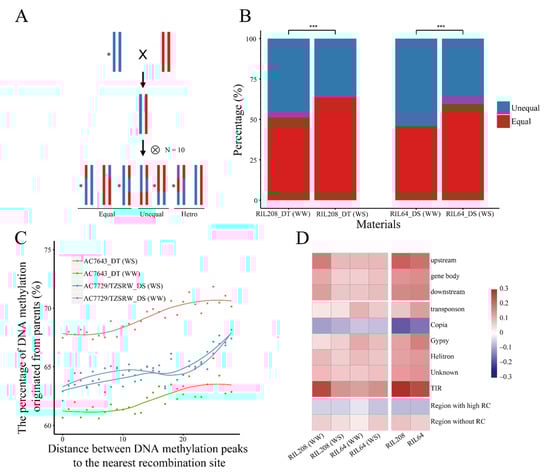 The inheritance of DNA methylation. (A) The diagram of the DNA methylation relationship of the RILs and sequence-origin parental lines. The blue and red bars mean DNA sequences originated from the two parental lines, respectively. The asterisk represents the existence of DNA methylation peaks. (B) The histogram of the proportion of DNA methylation peaks in RILs consistent with those of the corresponding parental line. WW: Well Water, WS: Water Stress. ***: p < 0.001, χ2 test. (C) The xy-plot of the proportion of DNA methylation peaks in RILs consistent with that of the parental lines and the distance to the nearest recombination site. (D) The heatmap of the conservation of DNA methylation in different regions. Data was normalized by random DNA segments of length equal to DNA methylation peaks. RC: Recombination.