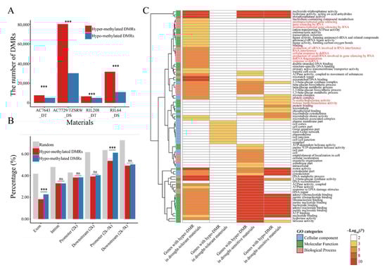 Summary of differentially methylated regions (DMRs). (A) The number of DMRs in four inbred lines. Hyper-DMRs mean regions where DNA methylation levels increased under WS, while hypo-methylated DMRs stand for regions of decreased DNA methylation levels under WS. ***: p < 0.001, χ2 test. (B) The proportions of DMRs located in different genetic elements. ***: p < 0.001, ns: not significant, χ2 test. (C) Gene Ontology (GO) enrichment terms of genes with DMRs in gene body. Genes involved in establishment and maintenance of DNA methylation were highlighted by red color.
