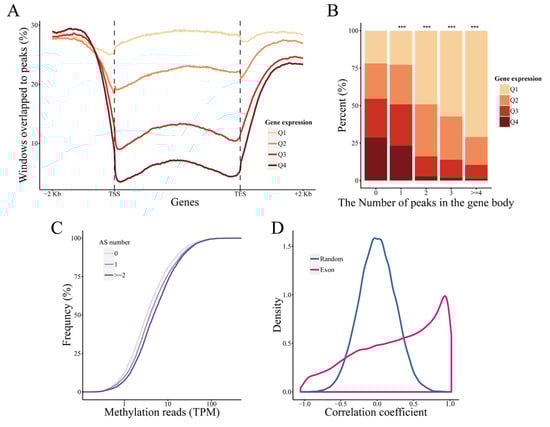 DNA methylation was related to gene expression and alternative splicing. (A) The proportion of DNA methylation peaks are plotted along the gene region as well as the upstream (-2 kb) and downstream (+2 kb) of genes with different expression levels. (B) The expression pattern of genes with varying number of DNA methylation peaks in gene body. ***: p < 0.001, χ2 test. (C) The DNA methylation levels of genes with varying alternative splicing (AS) events number. (D) The distribution of correlation coefficients between the expression and DNA methylation level of exon in genes with multiple exons.