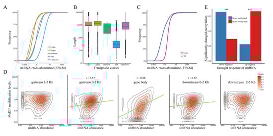 TEs are an important part of the plant genome, and TE silencing by DNA methylation is of great importance. The gene NMR19-4, located in the promoter regions of pheophytin pheophorbide hydrolase (PPH), negatively regulates PPH expression and leads to a variation in leaf senescence []. An 82-bp MITE inserts ZmNAC111 into the promoter and represses gene expression via RNA-directed DNA methylation, resulting in increased drought sensitivity []. In our study, DNA methylation modification, variation under drought stress, effects on nearby gene expression levels of different classes of TEs, and the correlations with siRNA abundance all showed distinct patterns, highlighting functional differences in TEs. However, only a few previous studies have reported that DNA methylation in specific TE families is associated with distinct functions [,], and information regarding this is still limited. The DNA methylation characteristics of these TEs should be fully considered in subsequent studies.
