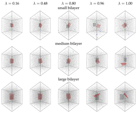 In Figure 1, we present configurations from the decoupling simulations performed on three bilayer graphene samples with small, medium and large size. We place the samples at the centre of a cubic box and solvate with saline water. In Figure 1, we decouple only the red graphene layer. The black layer interacts regularly with the environment and serves as a reference. We scale down the Van der Waals interactions of the decoupled graphene by increasing the parameter on the basis of Equation (2). At small values, the bilayer configurations are stable due to the adequately strong interlayer interactions. The layers preserve a parallel orientation and they can only twist at small angles against each other. With increasing , the Van der Waals interactions of the decoupled graphene decrease. This makes the decoupled graphene disconnect from the reference layer. As → 1, the decoupled graphene moves freely inside the box. The decoupling interactions become small enough, so that we may to observe configurations in which the two layers intersect. This is due to the term on the denominators of Equation (2), which makes the Van der Waals potential go to zero in a well-behaved manner with . The reference layer remains at a fixed position through the simulations, by imposing position restraints on the atoms. However, we can see in the snapshots of Figure 1 that when the two layers are apart, the reference layer is displaced from the box centre to the opposite direction of the decoupled graphene. This is because we change the periodicity on the representation of the simulated trajectories, setting the center of mass (COM) of both layers at the center of the simulation box.
