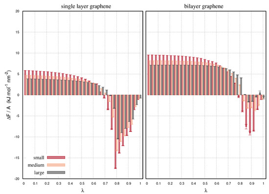 Figure 2, shows the derivatives of the free energy as a function of the decoupling parameter, . Increasing from zero to one represents a gradual change from a system with full Van der Waals interactions, to a system where the decoupled graphene is not interacting with the environment. We use 31 steps evenly distributed in [0,1]. We consider both single layer and bilayer configurations. In the bilayer configurations only one layer is being decoupled. The free energy values are normalized by the area of the graphenes in order to highlight the finite-size effects of the calculations. Such effects are expected to be appreciable for small interfaces. As a result, small graphenes obtain greater free energy derivatives than the large. We also observe greater energy derivatives for the bilayer than the single layer configurations. This is due to the additional interactions of the second layer. At the low range, the energy difference is positive indicating the stability of the starting configurations. At advanced steps of the decoupling, > 0.7, the free energy difference is negative. At high range, the decoupling interactions are near zero so that the water molecules are allowed to sample the volumes occupied by the atomic sites of the decoupled graphene. This is the same reason why we may observe the layer intersections in Figure 1. The small interaction energy implies a rearrangement of the solvent phase that creates new, lower in energy configurations, making the energy decrease. The bilayer graphenes obtain a first negative energy difference at higher , than the single layer graphenes. This is because of the interactions of the reference layer that do not change upon decoupling. Likewise, the negative energy differences of the bilayers are smaller than those of the single layer configurations.