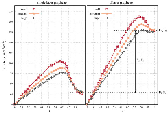 In Figure 3 we show the relative free energies of the decoupling simulations as a function of . The energies result from the summation of the energy derivatives shown in Figure 2, up to the value of . Using decoupling simulations we simulate the transformation of a single layer (state B) or of a bilayer (state A) into a system where one layer is removed (state C). At full decoupling (i.e., ) the relative free energy of the single and the bilayer graphenes is expressed by and , respectively. In the panels of Figure 3, the free energies converge nearly on the same value, regardless of the size of the layers. This is important as it approves that we used appropriate spacings in the thermodynamic integration. The convergence of the free energy differences also confirms the statistical consistency of our calculations, since the contributing integrals have resulted from individual simulations.