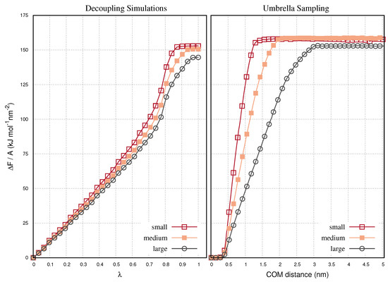(Left) Exfoliation free energies of bilayer graphene samples with small, medium and large size, computed by decoupling simulations. The energies are shown as a function of the decoupling parameter , and computed by subtracting the relevant curves shown in the panels of Figure 3, based on the expression = − . (Right) Exfoliation free energy of the same bilayer graphene samples computed by umbrella sampling. The energies are shown as a function of the interlayer distance as the one layer is pulled away from the other on the shear direction. The umbrella sampling simulations are performed in a previous work [40].