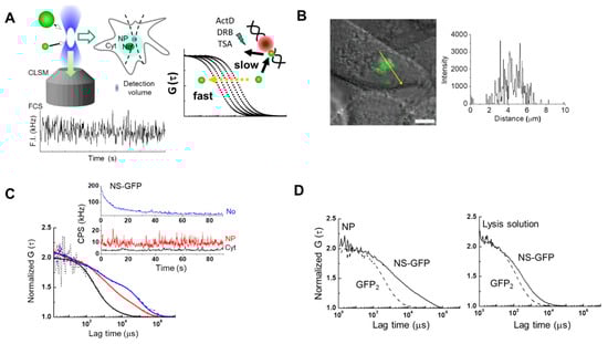 Figure 1 shows a schematic of the workflow used to analyze the movement of NS tagged with GFP (NS-GFP) in the cytoplasm, nucleoplasm and nucleoli, using CLSM and FCS (Figure 1A), and to quantitate GFP signals in HeLa cells expressing NS-GFP or dimeric GFP (Figure 1B–D). NS-GFP was mainly located in the nucleolus of HeLa cells, which is in line with previous studies, as shown in Figure 1B []. When applied to specific points (i.e., the confocal detection volume of approximately 0.12 fL) in the CLSM image, FCS measures averaged fluorescence intensity in counts per second (CPS in kHz), which varies over time due to random fluctuations in the number of fluorophores (Figure 1C). The averaged fluorescence intensity obtained by FCS measurement is proportional to the fluorescence intensity distribution in each compartment (Figure 1B,C). In the case of the nucleolus, the average fluorescence intensity is rapidly photobleached, decreasing to a steady state over time. In the present study, most of the NS-GFP molecules in the nucleolus were stationary, or the diffusion rate was too slow to avoid photobleaching. In contrast, measurements in the nucleoplasm and cytoplasm could be obtained without photobleaching, indicating that most of the molecules were diffusing freely (inset, Figure 1C and Figure S1). Fluorescence autocorrelation functions [FAFs, G (τ)s] are calculated from the raw intensity data and normalized to the fluorescence intensity, and measure the diffusion of the fluorescent protein at the measured point (Figure S1) [,]. In HeLa cells expressing NS-GFP, diffusion of NS-GFP in the dense nucleolus was significantly slower than in the nucleoplasm, which was in turn slower than the diffusion in the cytosol (Figure 1C). Each FAF fits to a two-component model: one fast diffusional component and another slow diffusional component. The fast component represents free diffusion, while the slow component indicates diffusion originating from binding interactions with much larger molecules or immobile structures, such as cellular organelles, although it is not possible to specify what causes such interactions to occur. When the diffusion motion of two or more components is detected, the ratio of the number of fluorescent molecules to each diffusion component can also be evaluated. In live cells, proteins can exhibit various diffusional movements because they can form protein complexes, or interact with organelles, and measurements are complicated by cytoplasmic and nucleoplasmic viscosity [,,]. Therefore, to simplify this complexity, it is helpful to also quantify the intracellular diffusion motion in samples obtained by cell lysis (Figure 1D).
