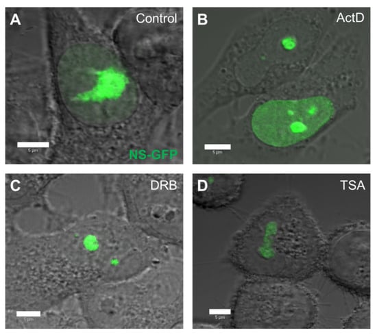 NS-GFP showed some effect in the modulation of NS-GFP fluorescence intensities. Cells treated with ActD had higher levels of NP fluorescence in the nucleoplasm than untreated cells, possibly due to nucleolar reorganization, which has previously been attributed to degradation of nucleolar structure under ActD treatment [,,,].