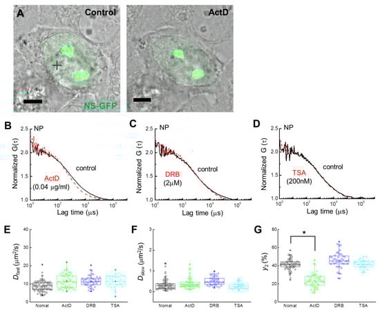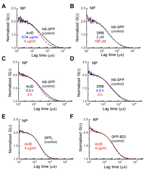 The dose-dependent effect of ActD on NS-GFP mobility may provide more insight into the nuclear dynamics of NS. The fluorescence correlation functions of NS-GFP with dosage and treatment time were calculated for the replication/transcription inhibitors ActD and DRB (Figure 4). Increasing ActD dosage from 0.04 µg mL−1 to 4 µg mL−1 resulted in no additional appreciable change in the diffusion coefficient (Figure 4A). Likewise, increasing DRB dosage from 2 µM to 100 µM did not change the diffusion dynamics, nor was the DRB treatment duration significant (Figure 4B,D). However, an increasing diffusion coefficient was correlated to increasing ActD treatment duration (Figure 4C). To determine whether this effect was due to the inherent dynamics of the NS binding motifs, or due to the incorporation of GFP, the same experiment was repeated with HeLa cells expressing tetrameric GFP. In addition, for comparison with NS, another well-known nucleolar protein, B23 tagged with GFP (GFP-B23), was analyzed to see if the same change in the diffusion coefficient occurred with ActD treatment [,,]. In contrast to NS-GFP, no changes in the diffusional dynamics were detected for these tetrameric GFP and GFP-B23 proteins with ActD treatment, indicating that the ActD treatment increases the diffusion speed of NS-GFP due to a reduction in NS bonding, rather than GFP, and that the effect is unique to the nucleolar protein NS (Figure 4E,F). On the other hand, when compared to GFP-Rpb I (RNA polymerase II tagged with GFP), significant changes in diffusional mobility were observed for both ActD and DRB treatments (Figure S2A,B).
