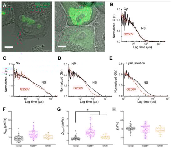 There are two GTP motifs on NS, and these motifs are closely related to the nucleolus-nucleoplasm shuttling function of NS []. In this study, FCS analysis was performed on the mutant proteins G256V and N176I, tagged with GFP, to determine whether these GTP motifs also affect the slow diffusion component detected in the nucleoplasm. HeLa cells expressing the G256V and N176I single amino acid substitutions in the G1 and G4 GTP-binding motifs of NS-GFP, respectively, were investigated by CLSM and FCS. Compared to the GTP-bound wild type NS, G256V-expressing HeLa cells showed significantly more relative fluorescence in the nucleoplasm, with even more nucleoplasmic localization than nucleolar localization (Figure 5A). Interestingly, while NS diffusion was unaffected by the G256V mutation in the nucleolus or in the cytosol, the G256V mutant showed a significant increase in diffusion mobility in the nucleoplasm and in lysed solutions of the cells (Figure 5B–E, see also Table 1 and Table 2). Unlike the effect of the ActD treatment, in which the ratio of the slow diffusion component was largely reduced, in the G256V mutant the diffusion coefficients of the slow diffusion components increased (Figure 5F–H, Table 1). On the other hand, N176I showed strong localization in the nucleolus, similar to NS, but its diffusion rate in the nucleoplasm was greatly accelerated compared with that in the nucleolus (Figure S3 and Table S1). However, mobility in the nucleoplasm was less changed compared to G256V (Figure 5F–G).
