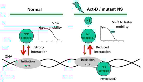 The observation of ActD modulation of the NS-GFP slow diffusion coefficient indicates that ActD potentially induces both less transient bonding and reduced overall bonding of NS-GFP in the nucleoplasm. Furthermore, the fact that the diffusion of NS-GFP is accelerated only by ActD, which is an inhibitor of the initiation of DNA replication, strongly suggests that NS-GFP is involved in the formation of a series of complexes related to the initiation of DNA replication. Although it is unclear what molecular interactions maintain the slow diffusion of NS-GFP, our results thus suggest that NS-GFP is closely related to the initiation of DNA or RNA replication.
